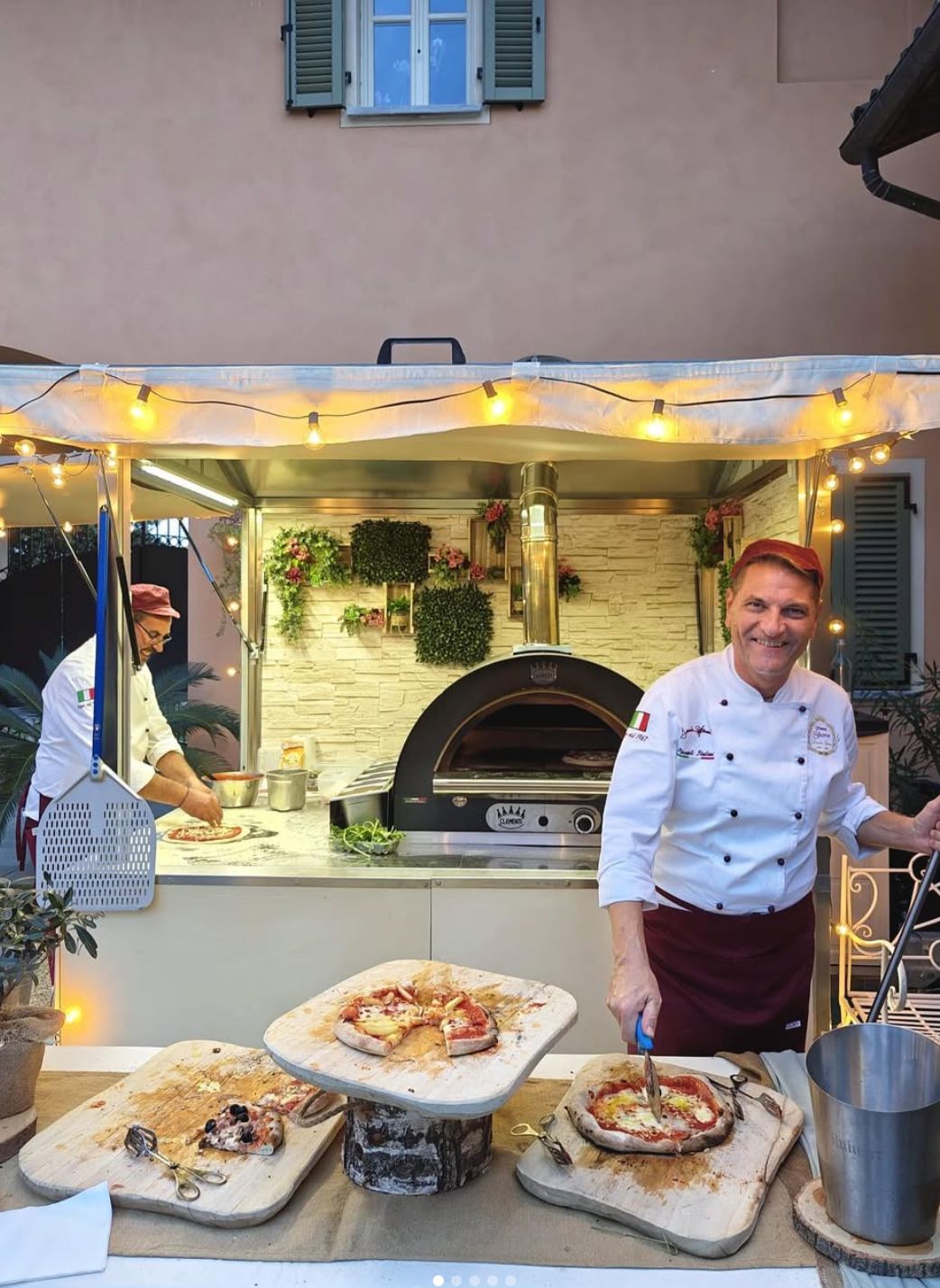 La postazione show cooking si serve di un carrello, allestito a tema rustico e dotato di forno professionale ad alta temperatura, piani di lavoro integrati e piano di servizio in legno di cedro. La preparazione della pizza è a vista degli ospiti.
